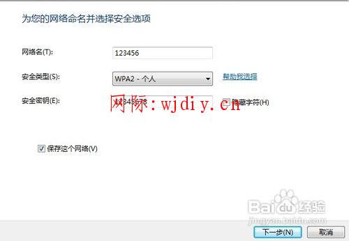 填好网络名(用作无線网络的SSID),然后是填写安全密钥(用作无線的连接密码),把“保存这个网络”勾上,然后点击下一步。