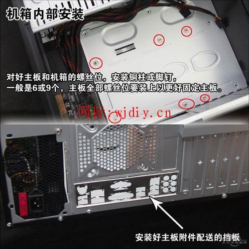 安装主板有一定技巧,首先要对好主板和机箱的螺丝位,然后在机箱相应的螺丝位上安装铜柱或脚钉,一般是6或9个,主板全部螺丝位要装上以更好固定主板。然后安装主板配件附送的挡板(要先把机箱标配的拆掉,尽管暴力拆吧,以后不会用到的)。