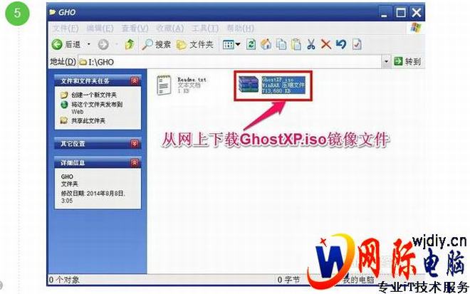 5,先在U盘建一个GHO文件夹(我的U盘为I),把下载的GhostXP系统映像文件复制到U盘里,如图:
